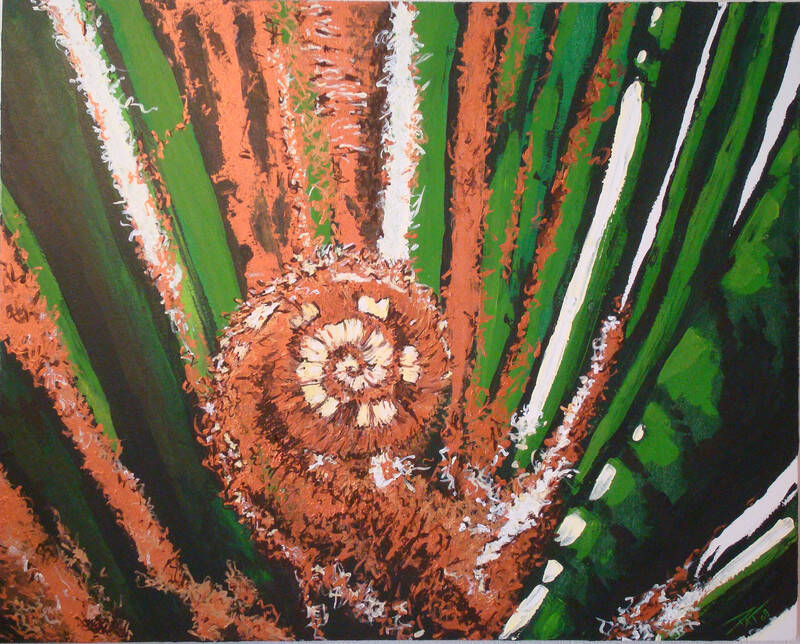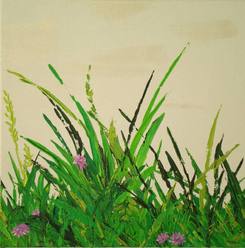 L'artiste pratique l'acrylique et le mortier de sable sur toile.