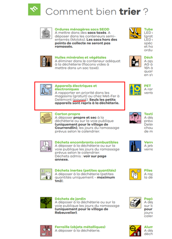 Cependant, nous souhaitons préciser que les habitants peuvent déposer GRATUITEMENT leurs appareils sur leur site à Delémont.